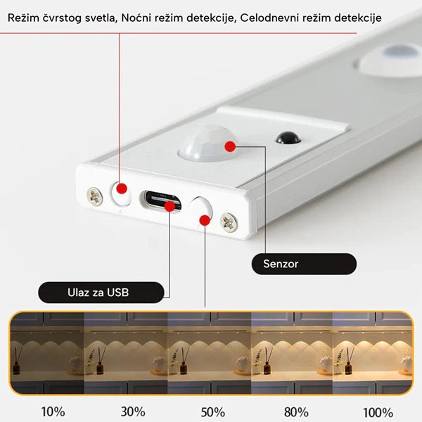 Lampa dolazi sa integrisanim nosačima i uključuje dve pločice sa samolepljivom trakom, omogućavajući jednostavnu instalaciju bez potrebe za bušenjem zidova. Bele je boje i nudi tri opcije osvetljenja: žuto, belo i kombinaciju žutog i belog svetla, koje možete lako odabrati pomoću tastera na lampi.